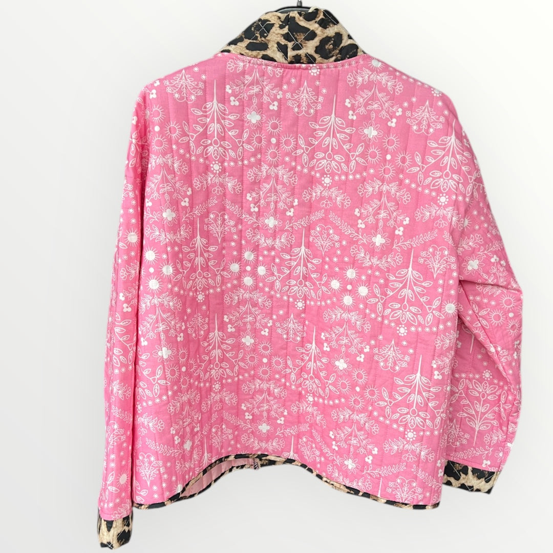 - Pinkes Quilt Muster mit weißen floralen Elementen, kontrastierender Leopardenbesatz