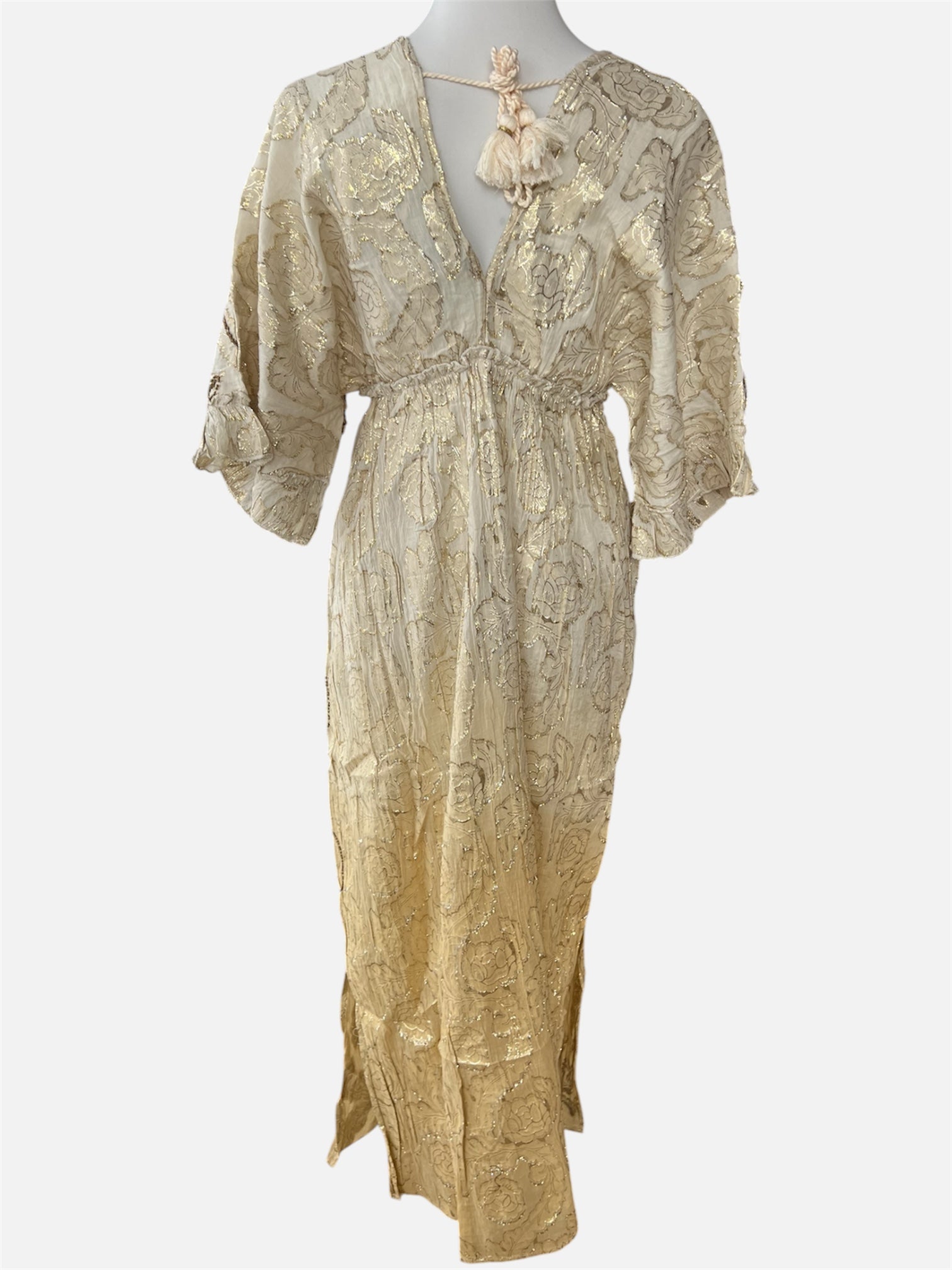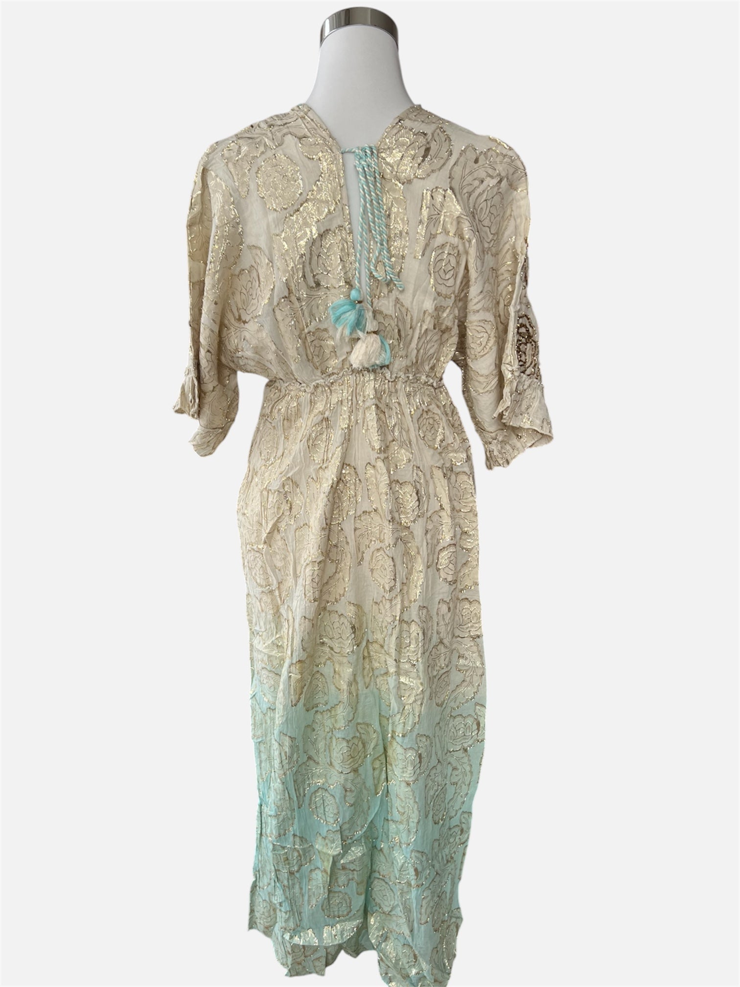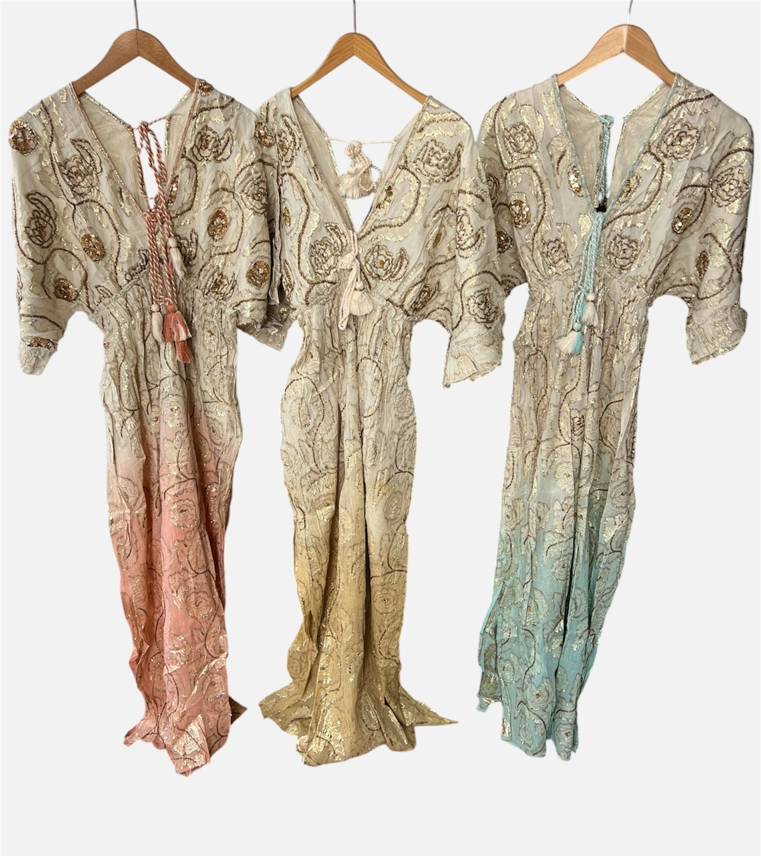 Wunderschönes Boho Maxikleid mit GoldstickereiDas handgefertigte Kleid besticht durch seine hochwertige Verarbeitung, feine Goldstickereien und den sanften Farbverlauf. Perfekt für Sommer, Strand, Urlaub, Festival oder besondere Anlässe. Perfekt für Sommer, Urlaub, Strand & Freizeit.