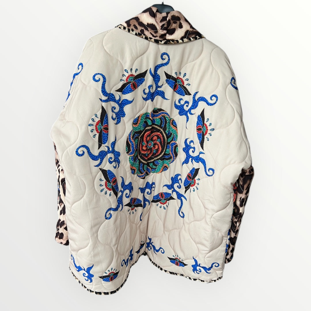 Diese einzigartige, gesteppte Jacke kombiniert markanten Leopardenprint mit einem aufwändigen grafischen Print auf Vorder und Rückseite. Die cremefarbene Basis bildet einen stilvollen Kontrast zu den dynamischen blauen und mehrfarbigen Musterelementen, die der Jacke einen kunstvollen und modernen Look verleihen.