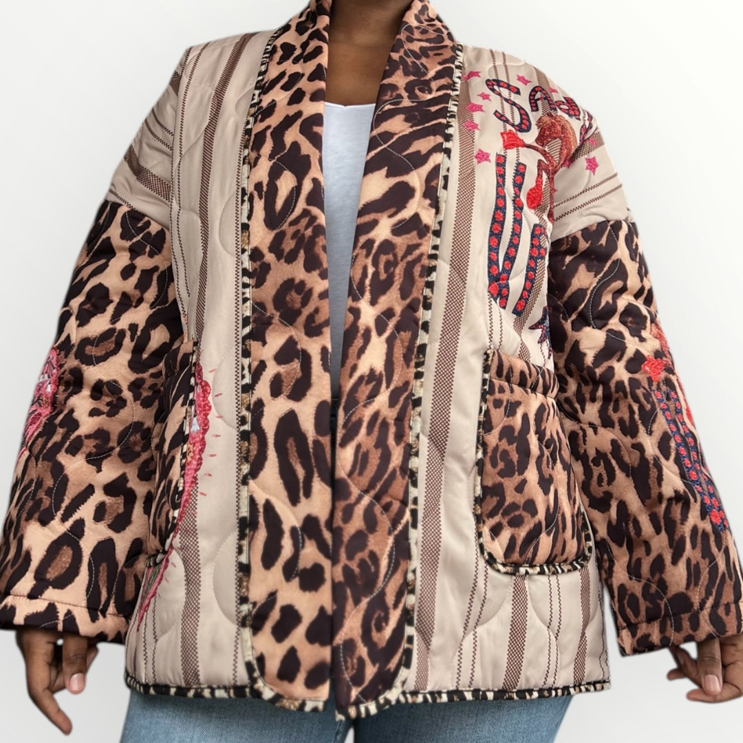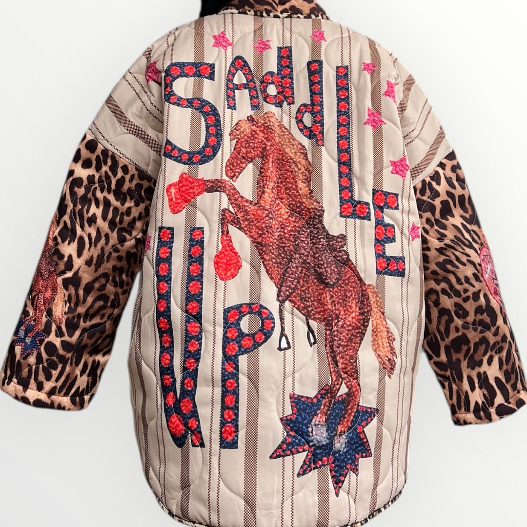 Gestepfte Patchwork Jacke mit ‘Saddle Up’ Stickerei und Pferdemotiv. Kombiniert Streifen und Leopardenmuster, besitzt zwei Fronttaschen und einen bequemen, leicht übergroßen Schnitt. Ein markantes Statement-Piece.
