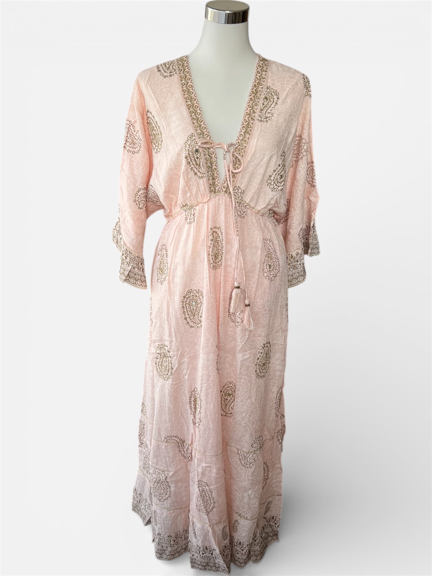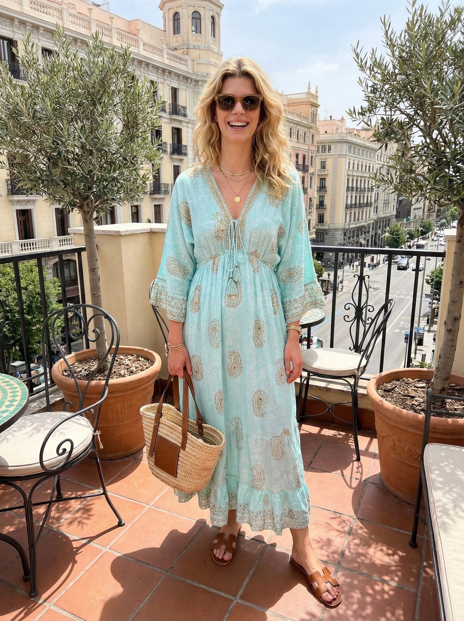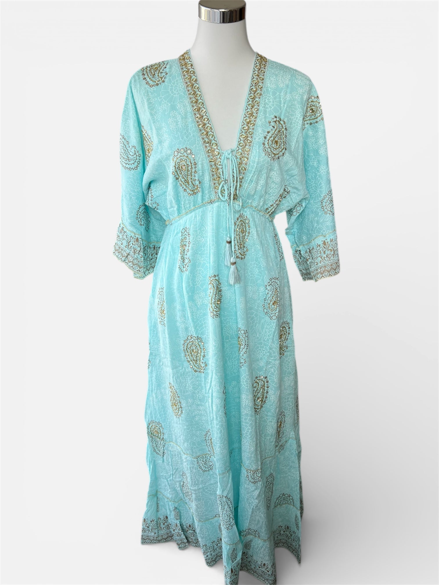 Damen Boho Maxikleid mit Paisley Muster. Fließender Schnitt mit V-Ausschnitt und Bindeband, 3/4 Ärmel und Stufenrock. Angenehm luftig, perfekt für Sommer, Urlaub und Freizeit. Ein Must-Have für alle Boho Liebhaberinnen!