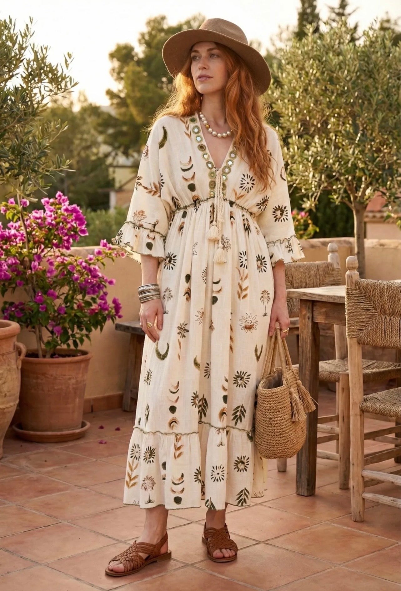 Wunderschönes Boho Maxikleid. Locker geschnitten, luftig & angenehm zu tragen. Mit V-Ausschnitt, dekorativer Stickerei, 3/4-Ärmeln mit Volants und Bindeband mit Quasten. Perfekt für Sommer, Urlaub, Strand & Freizeit.